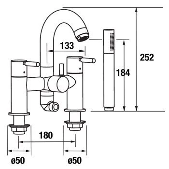 The Francis Pegler Visio Two Hole Leg Bath Shower Mixer is a full unit with a central bath spout in the middle of the unit with two temperature controls on either side. In the middle is a hose that is connected to the included shower head with a control to swap between these two functions.