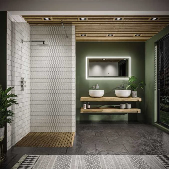 The HIB Element Illuminated bathroom mirror range combines double-layered units with radiant lighting. The mirror is mounted onto a clear sheet of glass, framed with adjustable ambient LED light. This creates a striking reflective effect and gives your bathroom a real wow factor. The integrated demister pad ensures crystal clear glass when taking baths or showers.