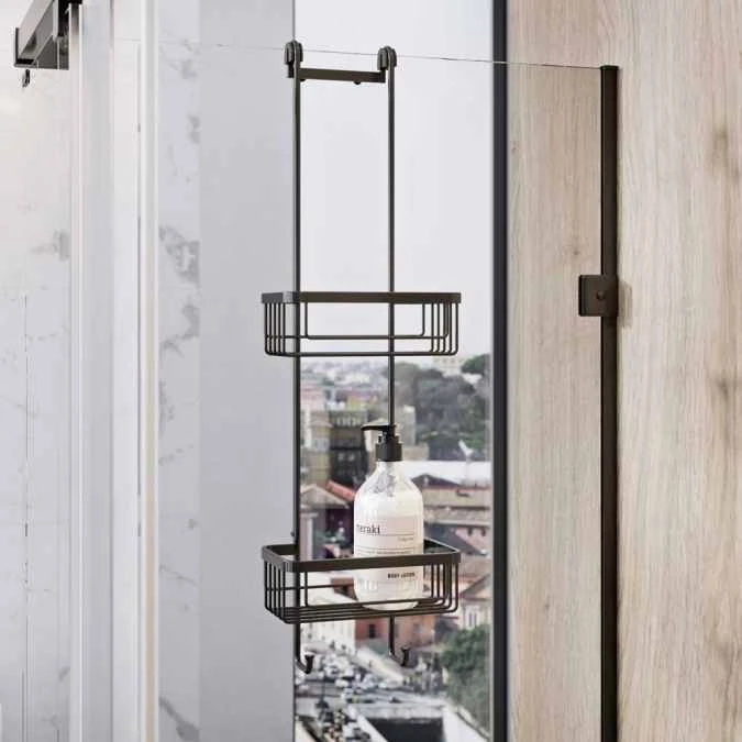 Roman Showers RSB01B Matt black double shower hanging baskets including hooks is the perfect solution to keep your shower space and shower tray clutter free. With a Quality Matt Black finish this Roman Shower Basket will colpliment and black shower enclosure from the Romans Shower Range inclduingn there Black Grid Panel.