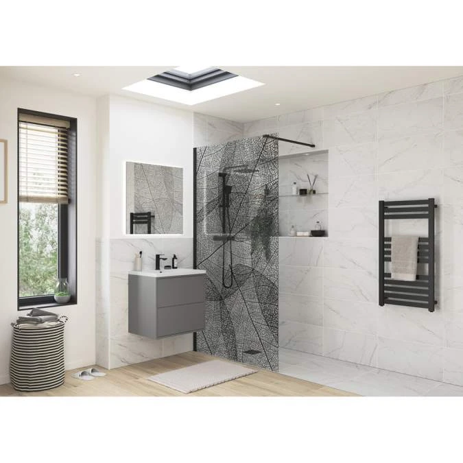Supereme wetroom panels with black leaf design are constructed from 8mm safety glass and feature Easy Clean Glass Treatment to keep your glass looking its best with minimal cleaning.